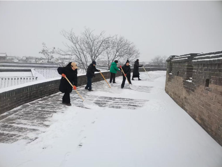 清晨6点,平遥古城的城墙上已是一番忙碌景象。全程6公里多的环线上,工作人员手持扫帚、铲子,正细心地清扫青砖上的积雪。
