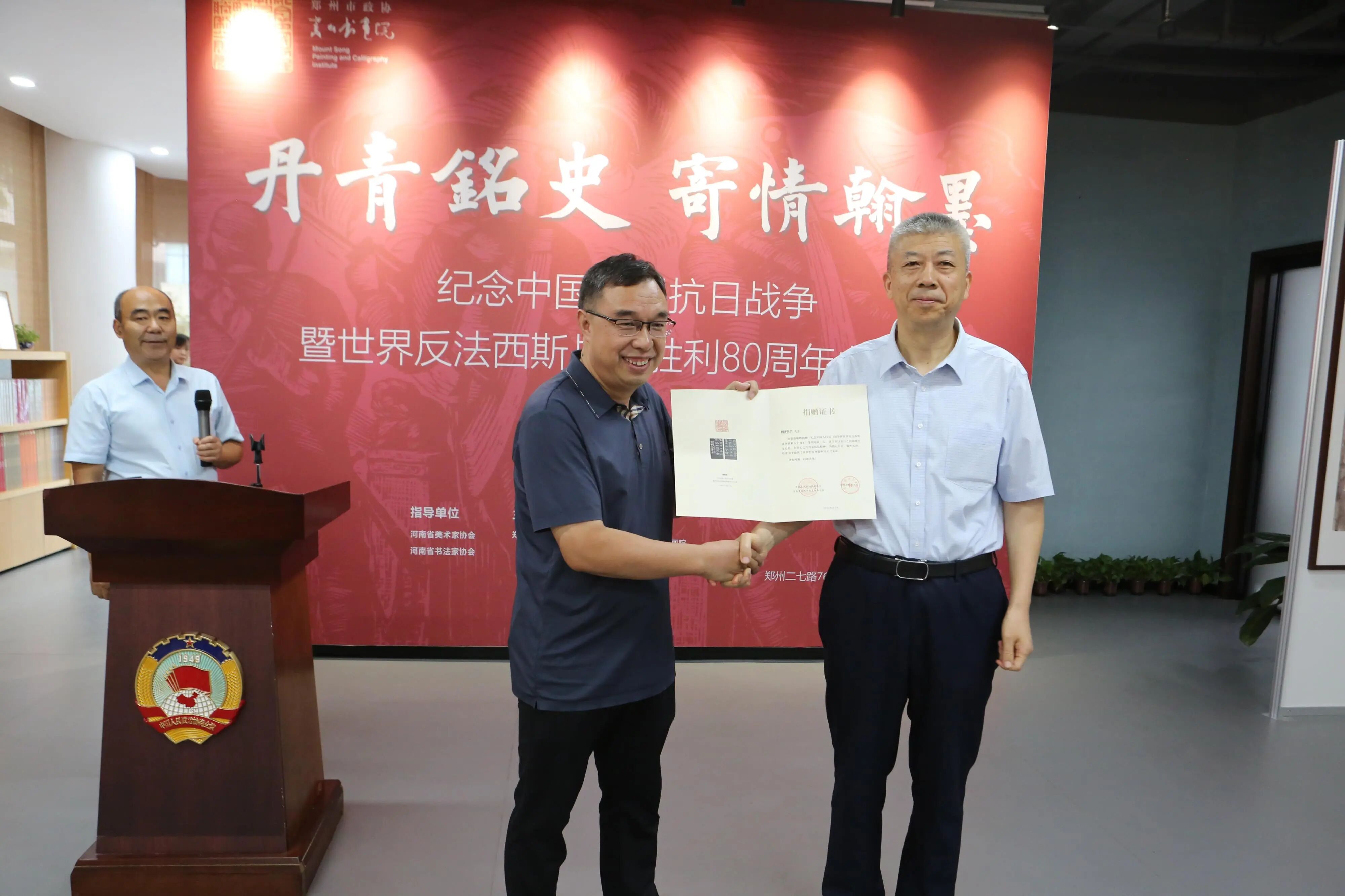此次展览由河南省美术家协会、河南省书法家协会指导,郑州市政协主办,郑州市政协嵩山书画院、郑州市美术家协会、郑州市书法家协会承办。展出的作品涵盖历史场景、英雄肖像、山河新貌等,以艺术形式再现党的光辉历程。作品主题鲜明,以艺术之笔重述抗战史诗,饱含历史温度与精神力量,让历史在笔墨间鲜活再现。