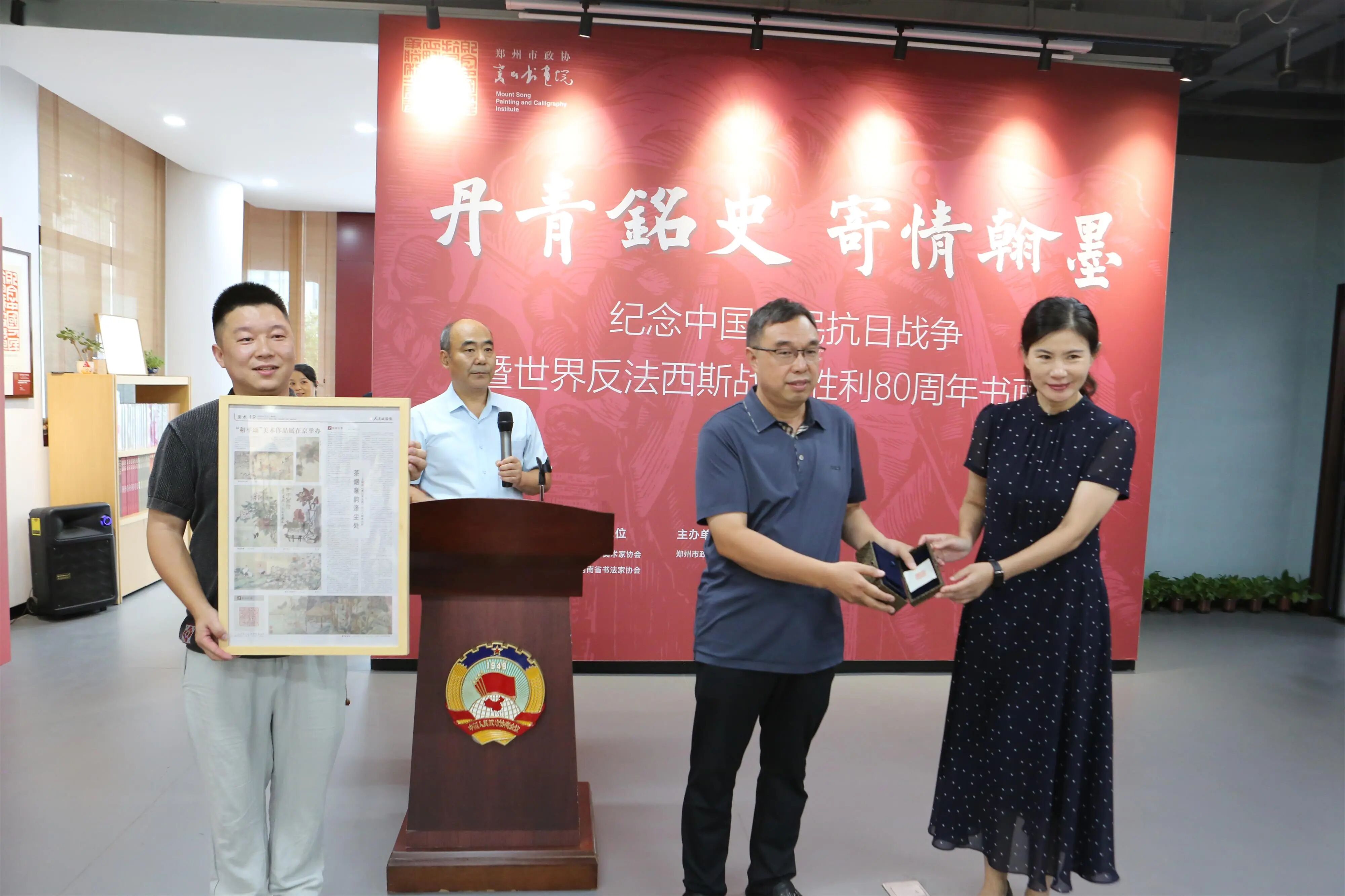 西泠印社社员、河南省书协篆刻委员会委员顾建全向郑州市政协捐赠《纪念中国人民抗日战争暨世界反法西斯战争胜利80周年》主题篆刻印章,刘艳秋代表郑州市政协接受捐赠。