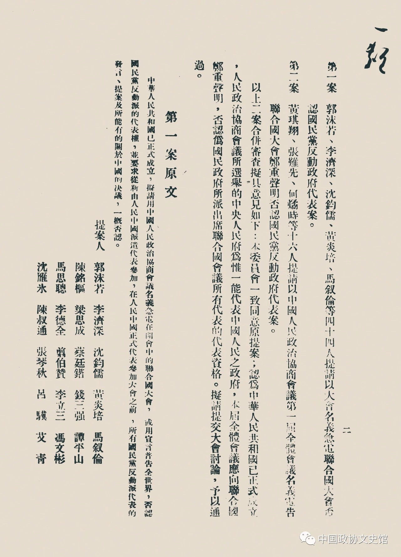 郭沫若等44位代表的提案提出:“中华人民共和国已经成立,拟请用中国人民政治协商会议名义急电在开会中的联合国大会,或用宣言普告全世界,否认国民党反动派的代表权,并要求重新由人民中国派代表参加,在人民中国正式代表参加大会之前,所有国民党反动派代表的发言、提案及所能有的关于中国的决议,一概否认。”