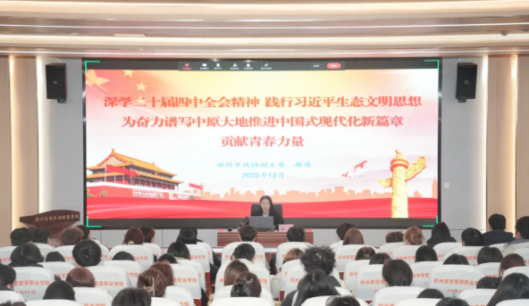 12月18日,郑州市政协副主席、民盟郑州市委会主委郝伟赴郑州商贸旅游职业学院,以“深学二十届四中全会精神,践行习近平生态文明思想,为奋力谱写中原大地推进中国式现代化新篇章贡献青春力量”为题,为学院广大师生讲授专题思政课。