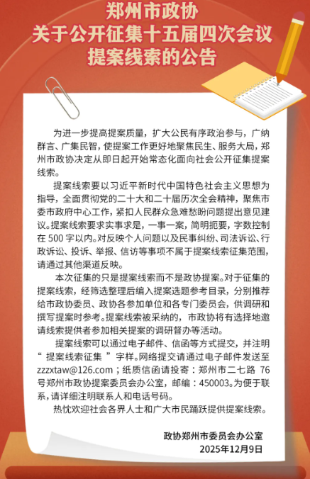 为进一步提高提案质量,扩大公民有序政治参与,广纳群言、广集民智,使提案工作更好地聚焦民生、服务大局,郑州市政协决定从即日起开始常态化面向社会公开征集提案线索。